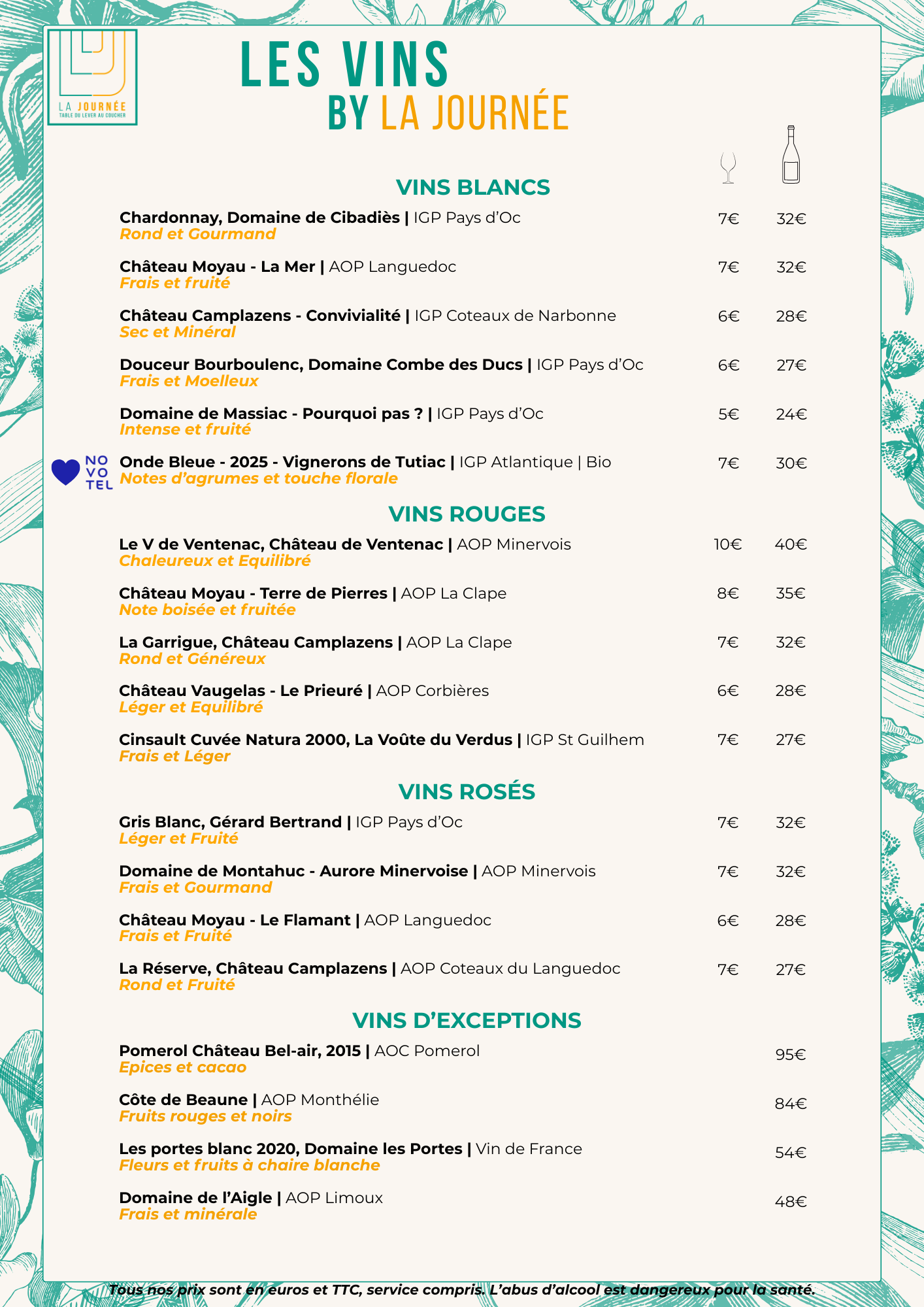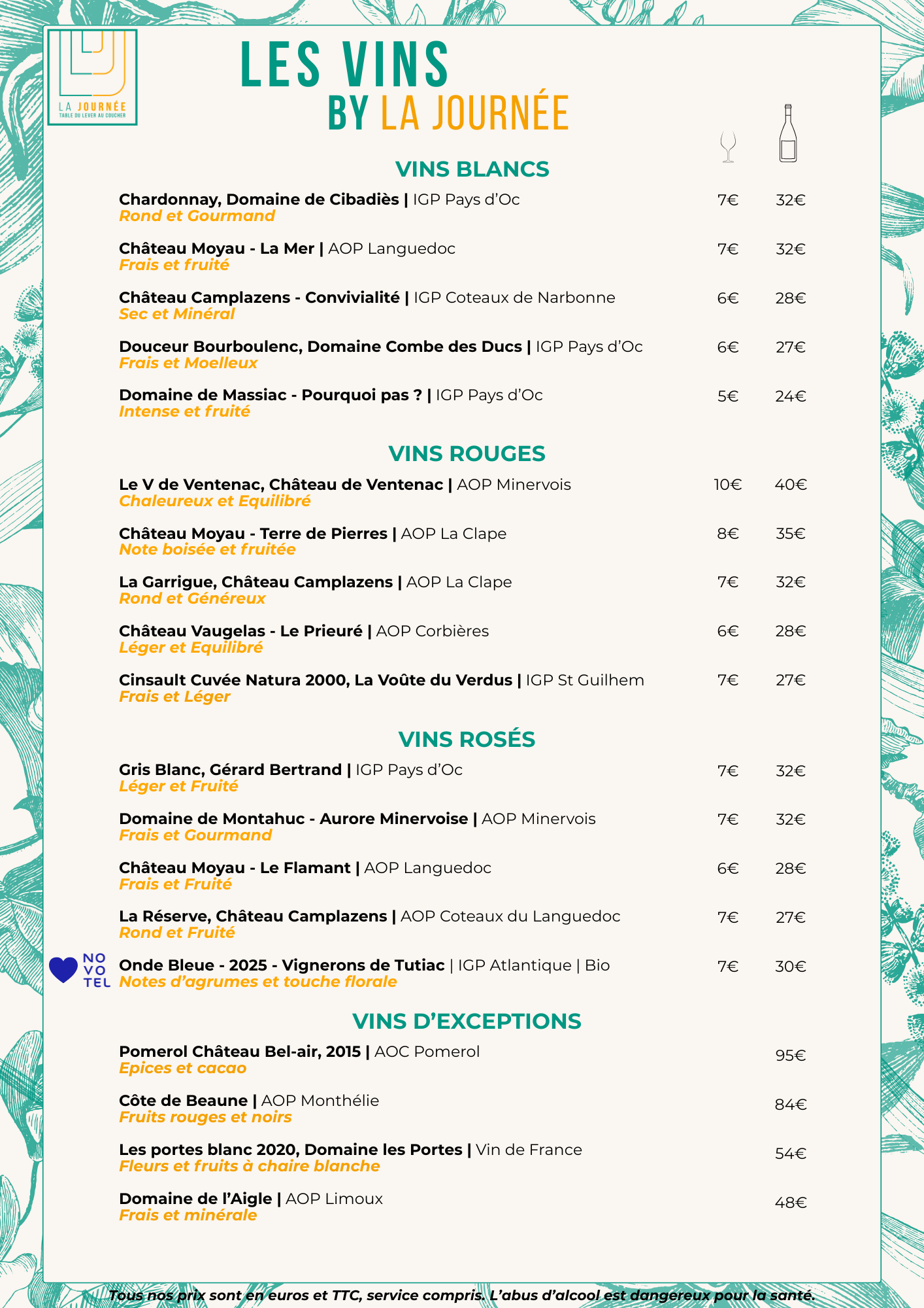 Pour compléter notre carte, le chef vous propose MIDIS et SOIRS de goûter à ses suggestions autour d’un menu du jour composé de plusieurs choix d’entrées, de plats et de desserts. Envie d’agrémenter votre repas ? Nous sélectionnons pour vous une carte de vins français réputés faisant la part belle au terroir local ! Dans notre bar, de nombreux cocktails sont à découvrir, des recettes classiques aux plus originales !