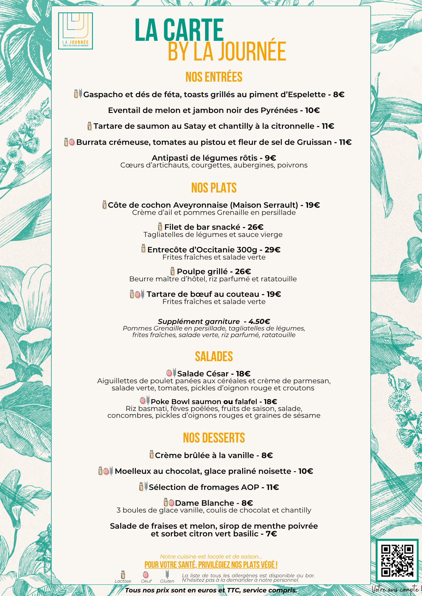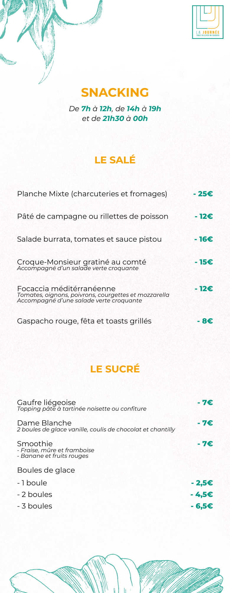 Plus qu’une carte, LA JOURNÉE propose une véritable invitation à l’évasion… Influencée par des recettes du monde, saines et gourmandes, elle présente tous les ingrédients pour vous faire voyager ! Ici, la cuisine est de saison, dans l’air du temps, et s’adapte à toutes vos envies.*