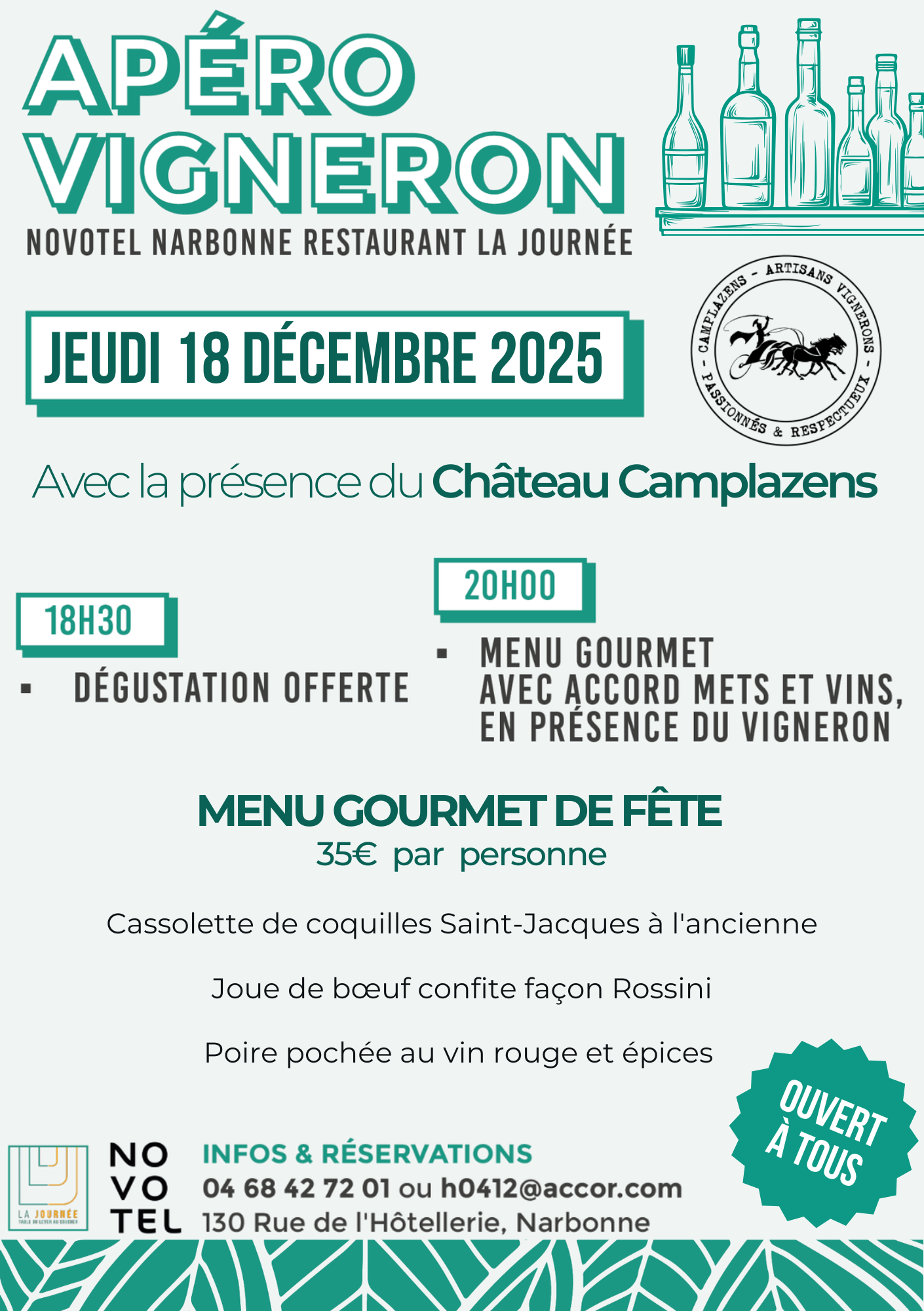 Cada jueves, nuestro Restaurante «La Journée» organiza sus Aperitivos Viticultores. ¡Venga a descubrir las añadas elaboradas por los Enólogos de nuestra Hermosa región! ¡Encuentre el Calendario de eventos haciendo clic en la foto! Degustación abierta a todos desde las 18:30 seguido de una cena gourmet con reserva! Hasta muy pronto!