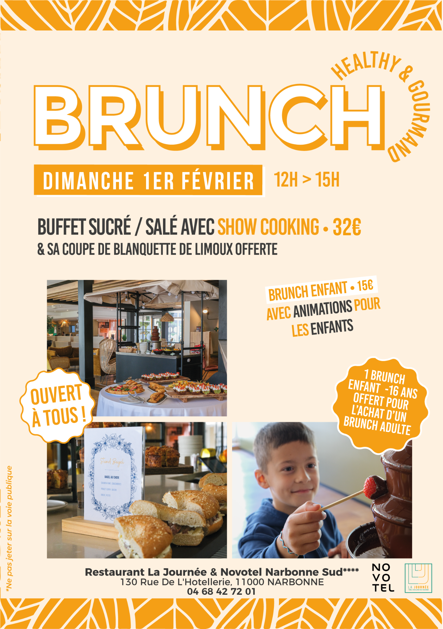 ¡Venga a descubrir Nuestro Brunch en Novotel a partir del 17 de abril de 2022! ¡Gourmand y Healthy a la vez, cada uno encontrará su Felicidad! Para consumir sin moderación de 12h30 a 14h30, 32€ por adulto/ 16€ Niño de +12años